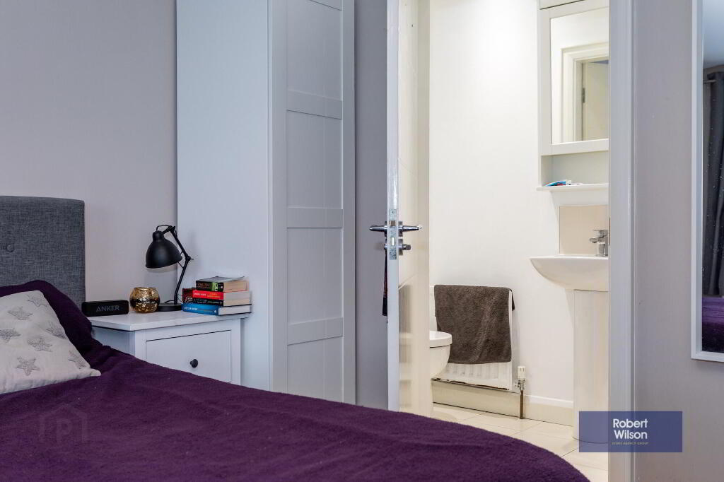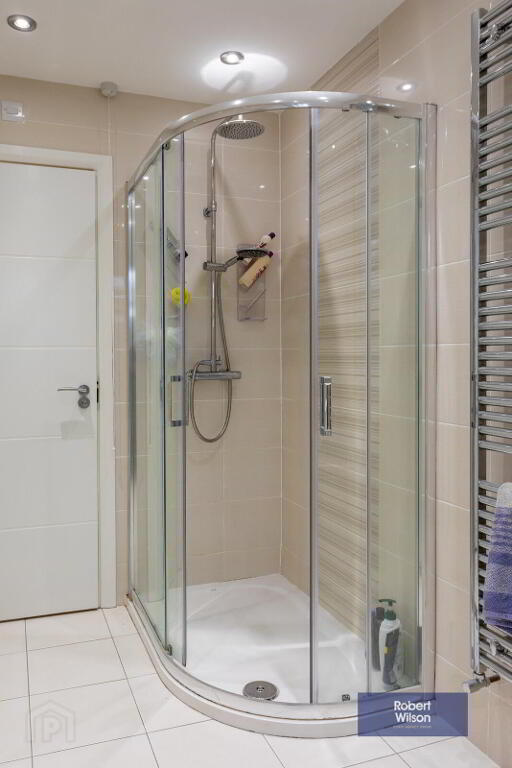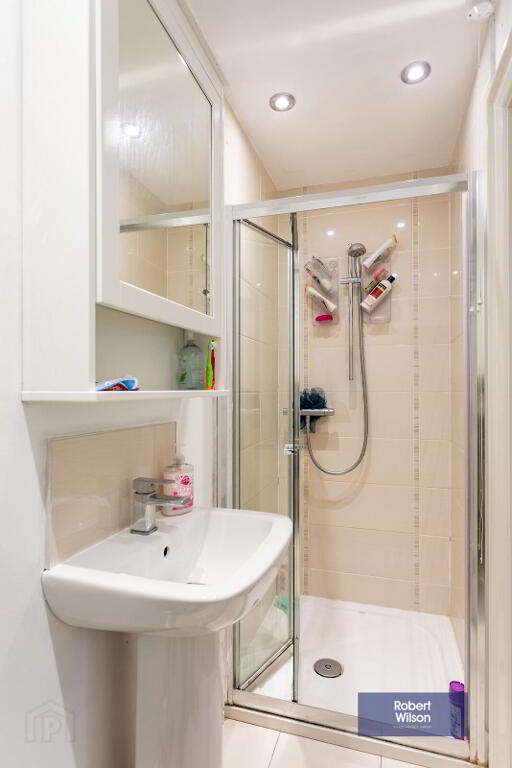 Three piece white suite comprising, low flush WC, pedestal wash hand basin with vanity unit over, walk-in shower cubicle, single panel radiator, tiled floor, part tiled walls, built in robe with boiler housing, recessed lights.