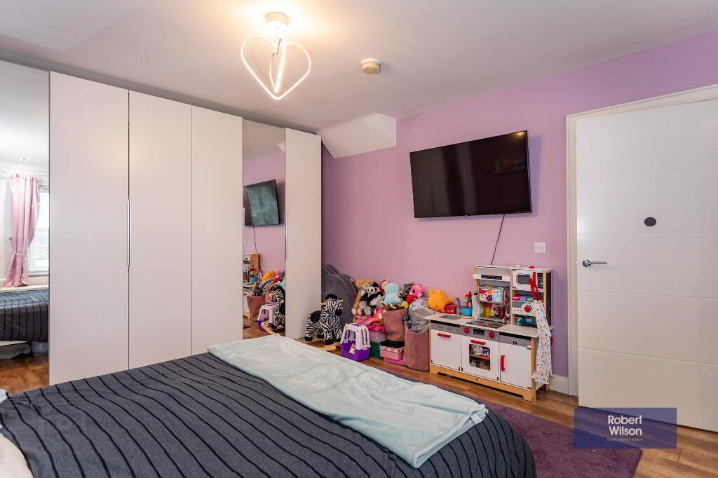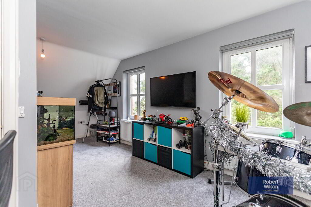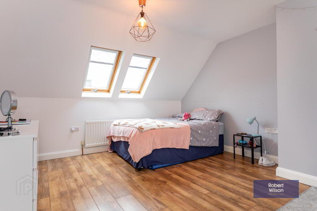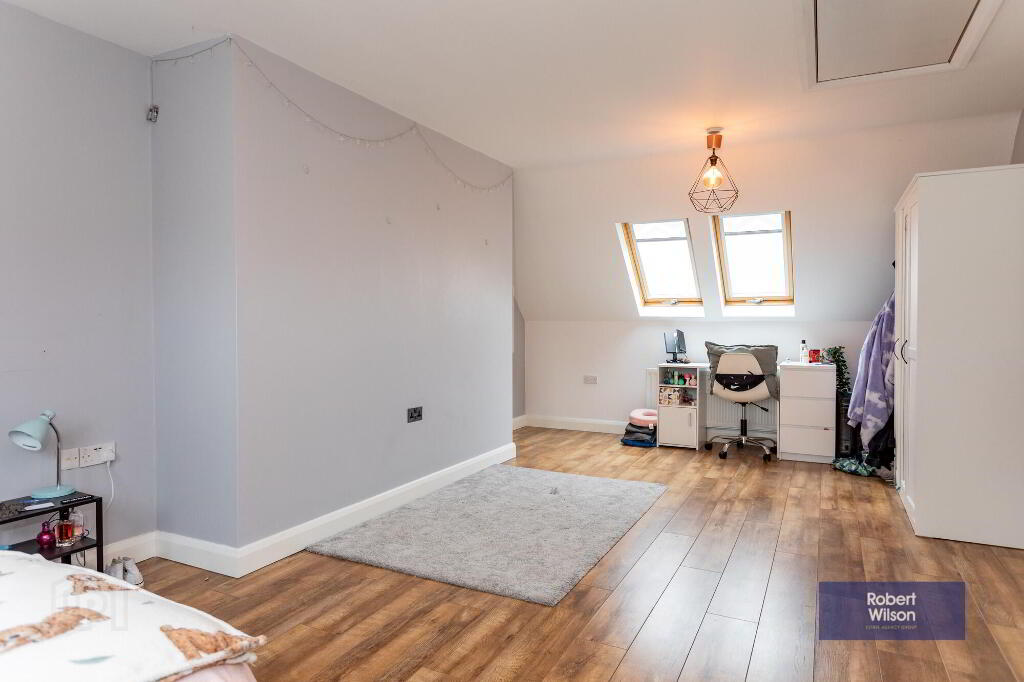 Wood laminate flooring, 2 front & 2 back facing Keylite windows, telephone point & wall mounted TV point, access to loft via pull down ladder.