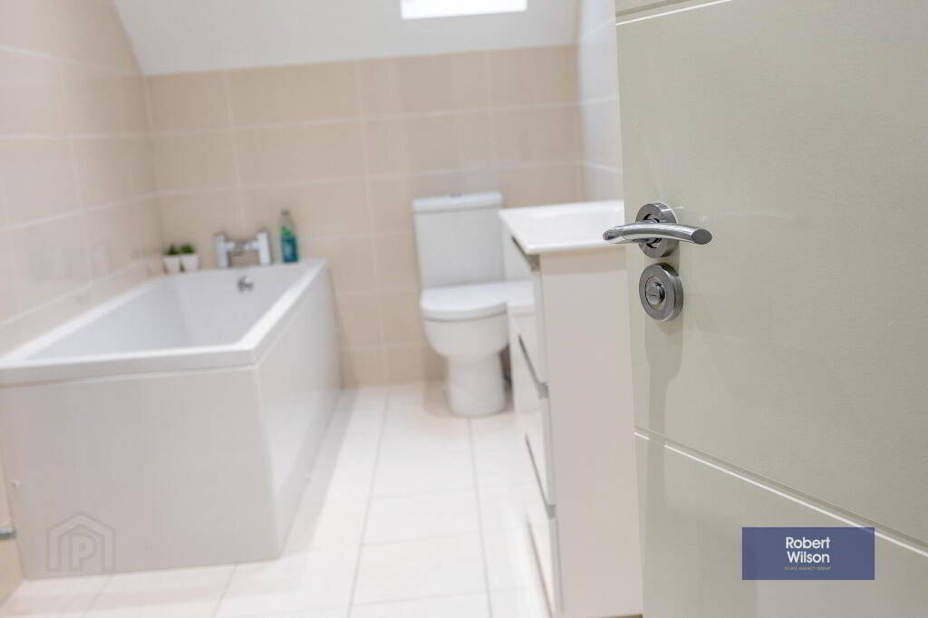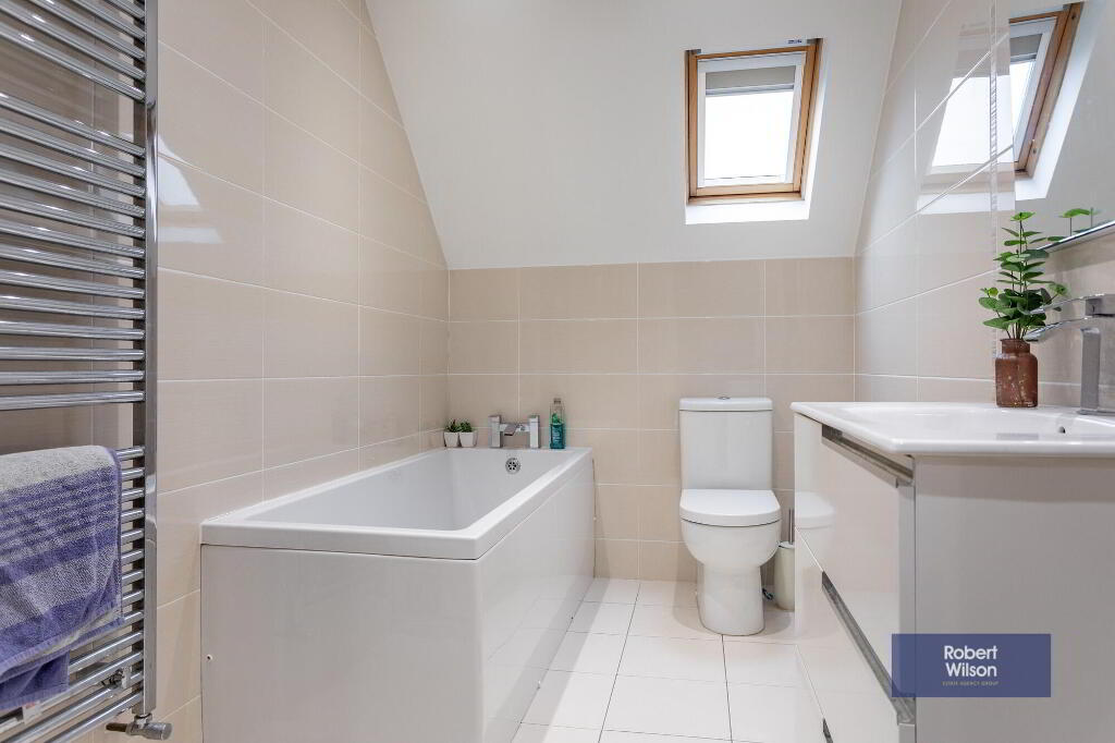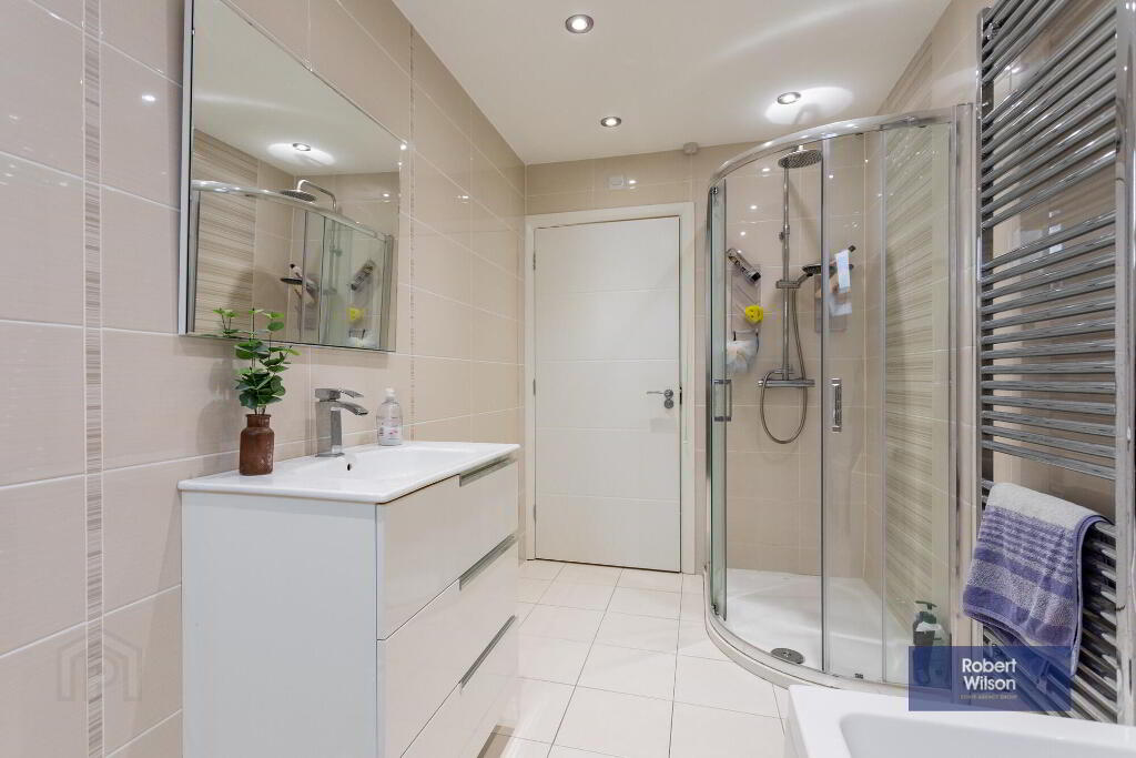 Four piece white suite comprising, low flush WC, wash hand basin incorporated in vanity unit, panel bath, walk in shower cubicle with rainfall shower, chrome heated towel rail, recessed lights, extractor fan, fully tiled walls & floor.