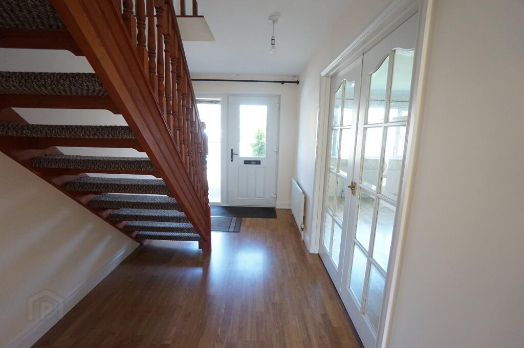 Composite front door with glazed panel and sidelight, staircase to first floor, single panel radiator and wood effect flooring.