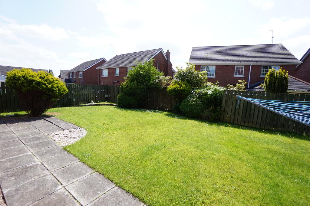 Front garden in lawn with various shrubs, tarmac driveway, side gate, rear garden in lawn with variety of shrubs and plants. Paved patio area and paths,.