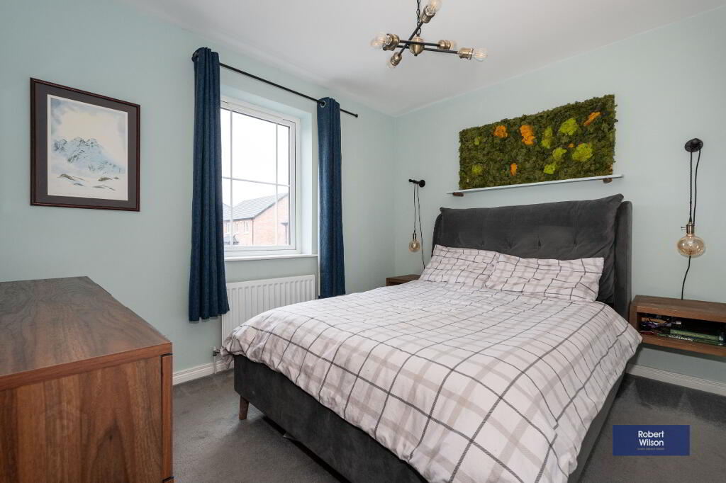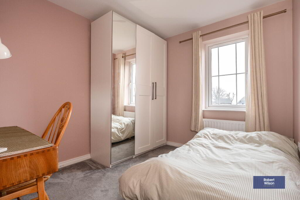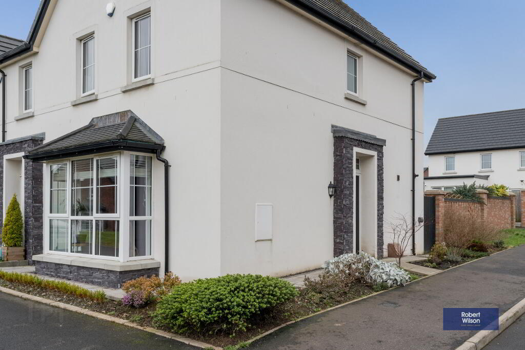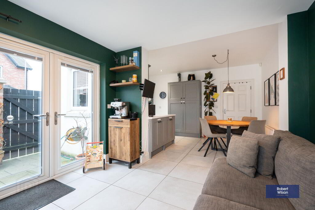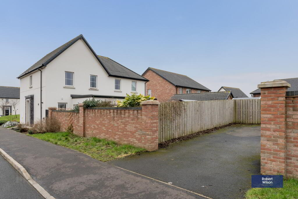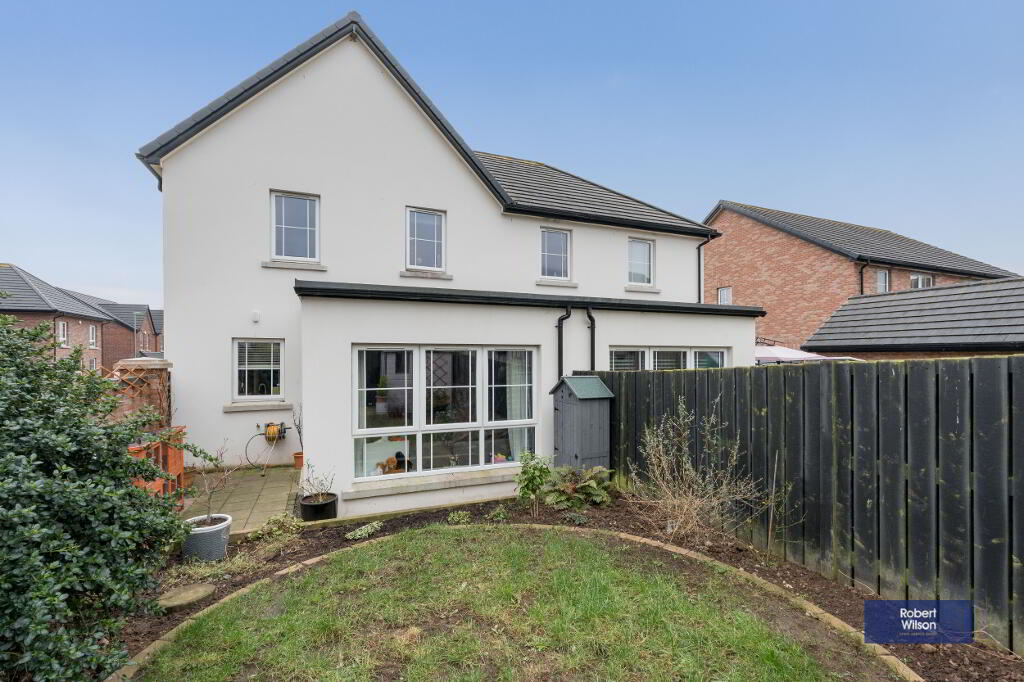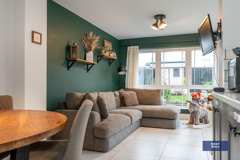 Outside, the property features a front lawn with a paved path, a fully enclosed rear garden, and dedicated parking. Within walking distance of schools, shops, and Moira’s vibrant amenities, plus excellent transport links—including a train station with connections to Belfast and Dublin—this home is ideal for modern family life.