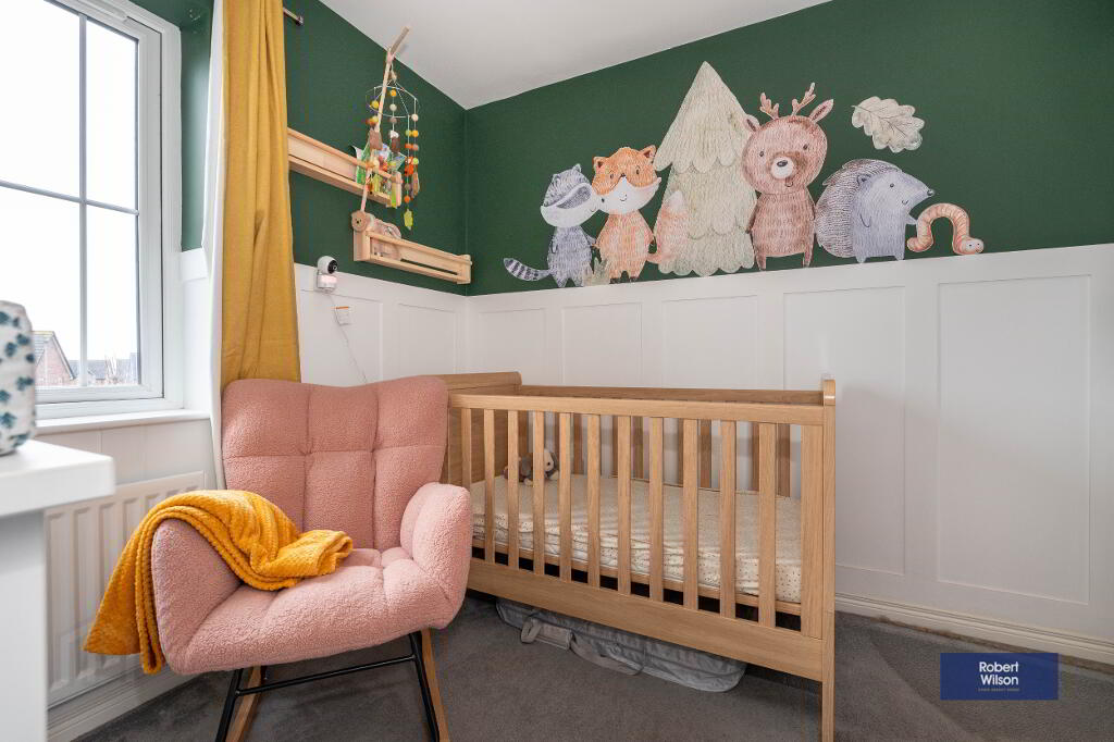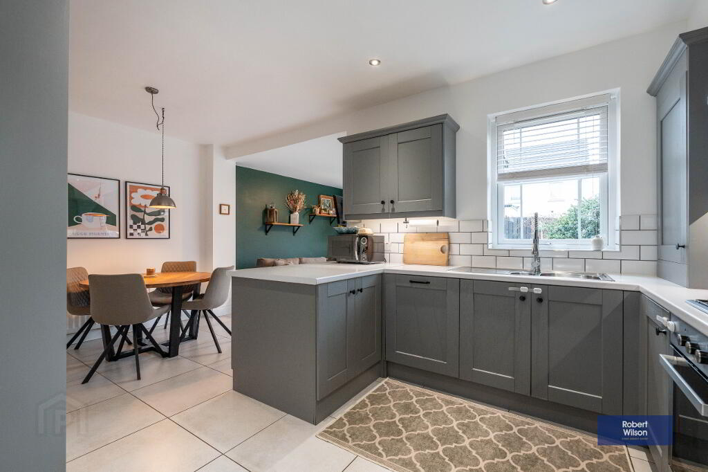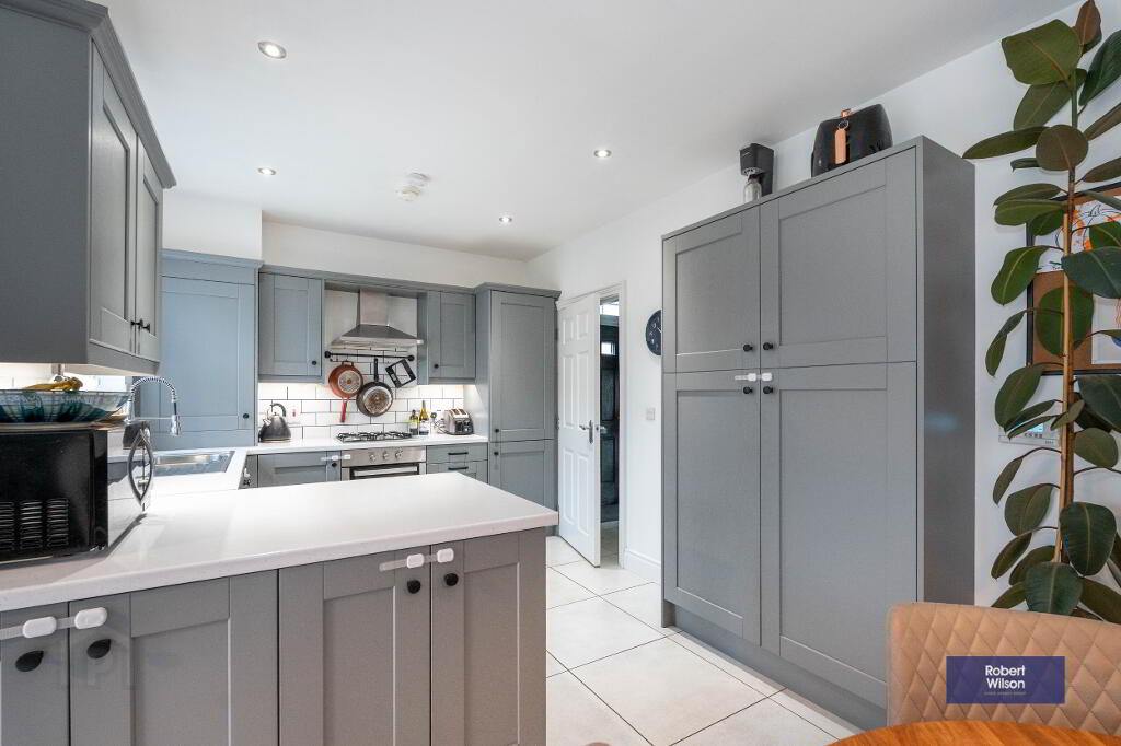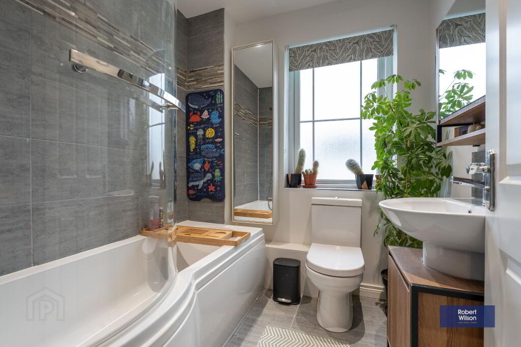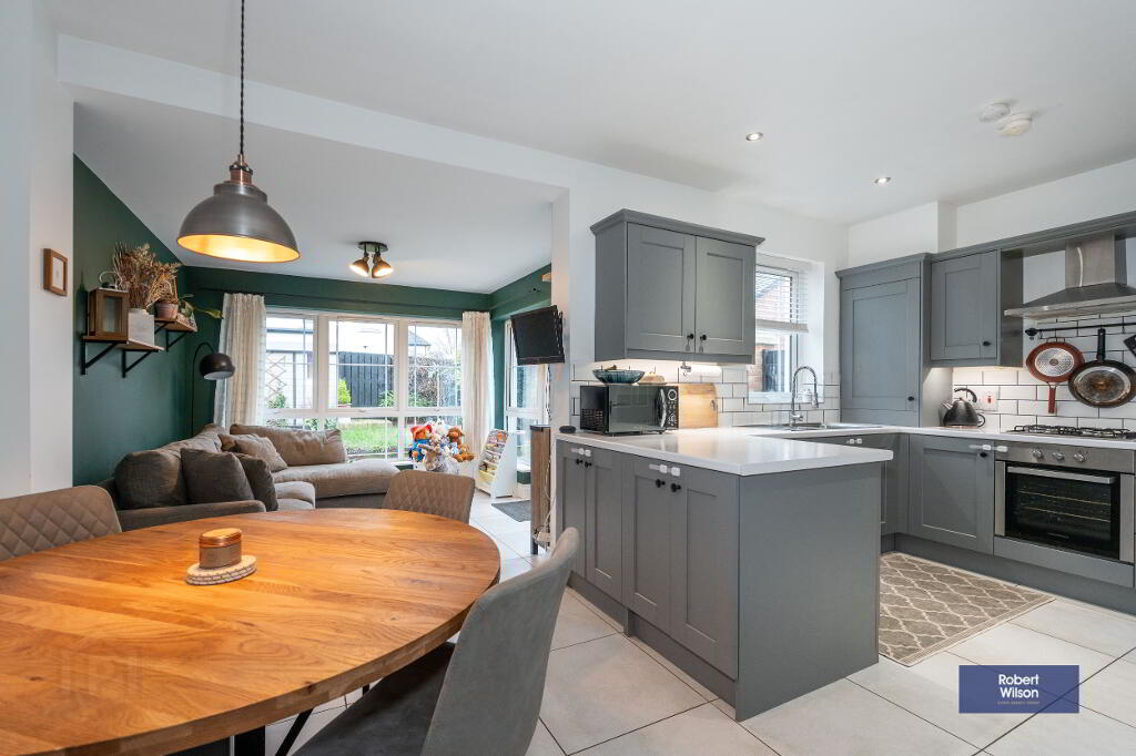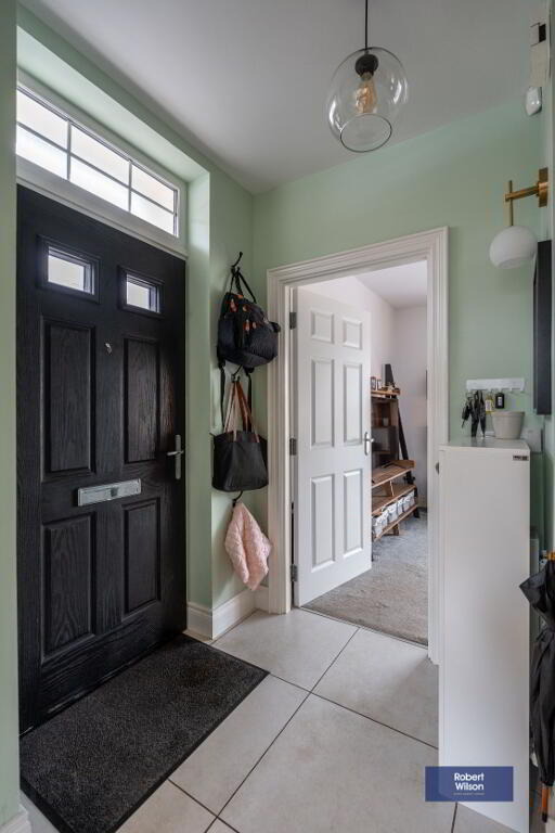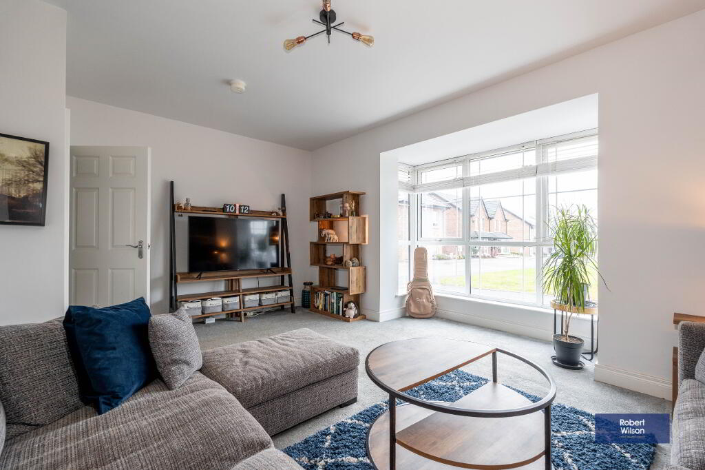 Outside, the property features a front lawn with a paved path, a fully enclosed rear garden, and dedicated parking. Within walking distance of schools, shops, and Moira’s vibrant amenities, plus excellent transport links—including a train station with connections to Belfast and Dublin—this home is ideal for modern family life.