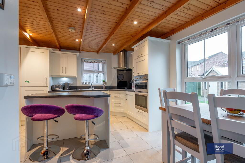 Welcome to 23 Wellington Park Drive, a beautifully presented home in a desirable location within walking distance of local school and amenities. The property features a unique thatch detail above the front door, adding character to its inviting exterior. Inside, the spacious lounge boasts a feature walk-in bay window and a cozy multi-fuel stove, while the open-plan kitchen/dining area offers modern appliances, an island with seating, and ample storage. A utility room and downstairs WC complete the ground floor.
