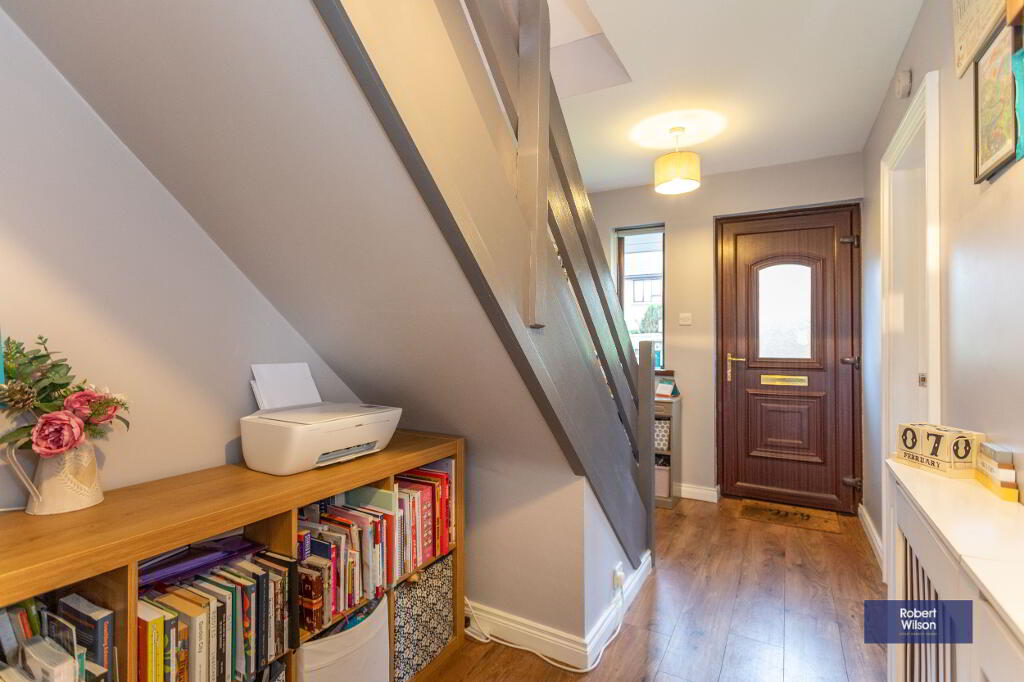uPVC Front door with glazed panel, staircase to first floor, wood effect flooring, single panel radiator.